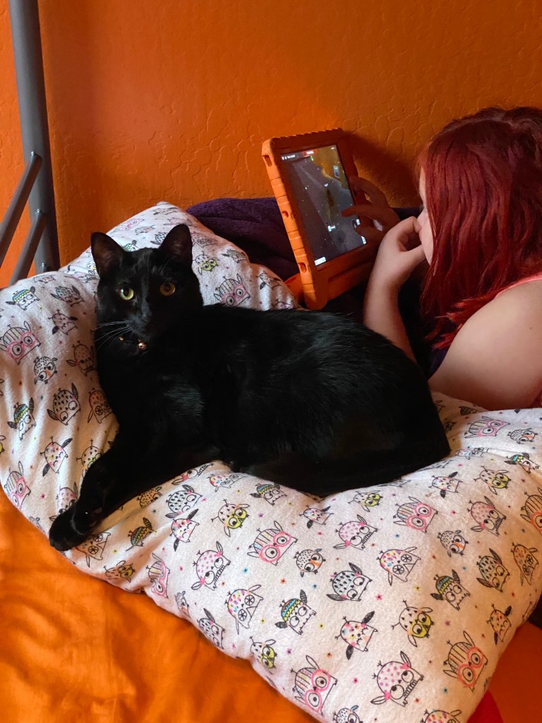 I have had a lot of people ask me about Pity Kitty. He is a very special cat. When my husband and I were living in Socorro, NM we found him in the hospital parking lot. At the time we were still dating, and we REALLY did not need a kitten. Pity was disgusting, covered in some kind of oil, and matted. He had a broken back leg that looked like it had been broken for awhile. I told my boyfriend (now husband) to leave the kitten in the parking lot and I would go back into work and see if anyone wanted the kitten. Shortly after I got back into work, I texted him and asked him if the kitten was still outside and he texted back “no, he’s sitting here next to me. I knew you would never forgive me if I left that cat in the parking lot.” It was at that moment that I knew I could make babies with that man! The vet thought Pity had been thrown from a car because he had asphalt stuck in some of his wounds. Pity went through surgery to have his back leg taken off since it had been broken for so long. He is the happiest cat, but we know he has a phantom leg because sometimes when he has an itch, he will lean back and the little nub left of his leg will shake like he is scratching himself and then he will look satisfied. He is the most affectionate cat I have ever encountered. He starts purring if you walk into the room, you don’t even have to look at him. The other day we were having the outside of our house painted and pity could see someone on the other side of the front door through the cracks, so he sat in front of the door for half an hour purring, just waiting for the person on the other side to open it and love him. He doesn’t care who or what you are, he loves everything with a heart beat, including the dogs. He regularly bathes our other cat and dogs. Pity Kitty also loves children. If we have a gaggle of kids in the house you can always bet Pity is in the middle of them. His favorite treats are water from the tuna can and spilled goldfish crackers. When he was younger he loved the laser pointer but now he just lays there and bats at it lazily. He is the best cat in the world, except, he cannot be the only cat. He is now on his FOURTH baby. He has to have another cat that he raised from a kitten or he is a total jerk. If he doesn’t have a baby he slams cabinet doors at 3 am, hops up on the counter and turns on the garbage disposal, knocks everything off of every horizontal he can reach and attacks feet. But once he has a baby all of those behaviors stop! His first kitten, Crookshanks had a neurological disorder and was only with us for about two years. Macazoe was a female, who hated all of us, and she went to live with one of our friends when we found Nibbler. Nibbler was a great cat. We had him for about 8 years and lost him to cancer not long ago. A friend of ours was walking home from our house one night when she called me and told me she had found a kitten in the street. She then told me “I fed it a can of tuna!” (thanks Laura) Her husband wouldn’t let her keep it so he came to my house and pity and I promptly fell in love. He was just a tiny kitten, but he was microchipped. We left a message with his owners, and they didn’t call me back for about a week. By the time the called us back the whole family was in love and he was named Nibbler. The lady came to pick him up and my Husband was so in love with the kitten he said “offer her $100.” I didn’t offer her the money, but I did tell her if she decided she didn’t want him to call me. Less than a week later she called me and told me she didn’t want the kitten and Nibbler became a permanent part of our lives. When Nibbler died I was heart broken and SURE we would not get anymore cats, everyone was just going to have to love pity alone and that was that! But between my husband, my daughter, my son, and Pity Kitty they wore me down. One day I was walking from my closet to the bedroom and Pity reached out and grabbed my foot and bit it and I yelled, “That’s it we are getting a kitten!” My husband (he works from home) hopped up and we went to Petsmart to adopt a kitten. Nibbler was mostly black, and I was still pretty sore from the loss, so I did NOT want another black kitten. Mr. Rogers had other plans for me though. I was holding another orange tabby and I was pretty sure he was the kitten we were taking home, but every time I walked past his cage, Mr. Rogers would stick his little paw out and grab me. Reluctantly I decided to hold him and I knew the minute I held him he was our new kitten. We instantly named him Mr. Rogers and surprised the kids with him when they got home from school. First thing Pity did was give him a bath and he hasn’t attacked a foot or slammed a cabinet since. Mr. Rogers bonded to my daughter and we have a ritual every school morning, she stands outside my bedroom door, waiting for me. Then he runs ahead of my and waits for me at my daughter’s door. When I open her door he hops up into her bed and starts walking all over her to wake her up! He LOVED Covid because the kids were in the house all day for school. All school day he lay in her bed purring. Pity Kitty doesn’t care about the Hamster, Misty, but Mr. Rogers wants to eat her.